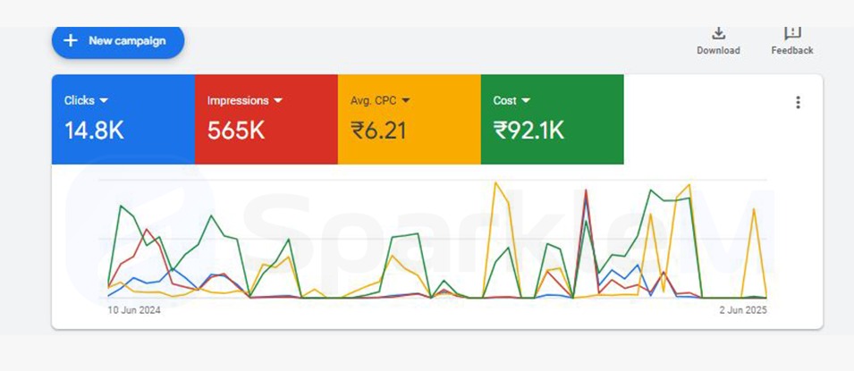 This Google Ads campaign delivered strong results over the reporting period, with a total of 14.8K clicks generated from approximately 565K impressions. The average cost per click (CPC) was highly efficient at ₹6.21, leading to a total spend of ₹92.1K. The campaign performance graph indicates fluctuations in activity, with several noticeable peaks, suggesting successful engagement during specific periods. Overall, the ad strategy appears to have maintained good visibility and steady traffic, achieving a solid balance between reach and cost-effectiveness. With further optimization and targeting, there's strong potential for even higher ROI in upcoming phases.
