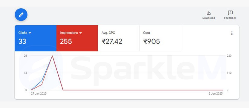 This Google Ads campaign was focused on generating bookings through direct call interactions. Over the tracked period, the ad received 33 clicks from 255 impressions, resulting in a total spend of ₹905. The average cost per click (CPC) was ₹27.42, reflecting the typically higher cost associated with call-intent ads due to their higher conversion potential. Most engagement occurred in a short burst on January 27, 2025, suggesting the ad gained rapid attention but then saw a drop in visibility or reach afterward. While the click-through rate appears strong, continued performance will rely on consistent ad delivery and further audience targeting to maintain steady interaction and maximize booking conversions.