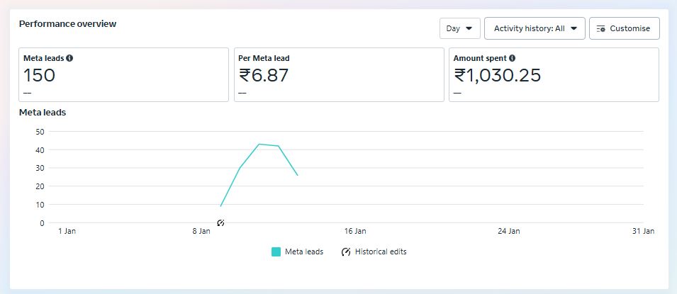 This Meta ad campaign was executed with the objective of generating leads through Facebook lead forms. Over the course of the campaign, it successfully captured 150 leads, with a total ad spend of ₹1,030.25, resulting in an impressively low cost per lead of ₹6.87. The lead volume peaked around January 10–15, demonstrating strong engagement during that period. The cost-effectiveness and performance curve suggest that the targeting and creative were well-optimized for lead generation. This type of campaign is ideal for building a potential customer database at a low acquisition cost, and further scaling could enhance results even more.