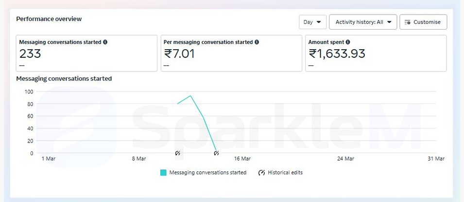 This Meta ad campaign was primarily focused on lead generation, with WhatsApp set as the destination for collecting leads. Over a 7-day period, the campaign achieved a total spend of ₹1,633.93 and generated 233 messaging conversations, resulting in an average cost of ₹7.01 per lead. The campaign started with strong engagement in the initial days and showed promising performance improvements as it progressed. As optimization efforts continued, the cost per lead gradually decreased, indicating that the ad was becoming more efficient over time. Overall, the results reflect that WhatsApp-based lead generation through Meta ads is an effective and cost-efficient strategy for achieving high engagement and lead volume.