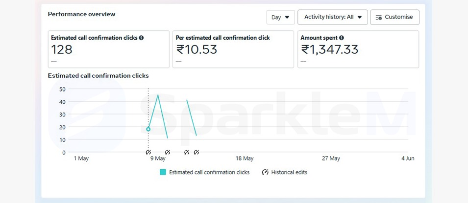 This Meta ad campaign was designed to drive booking inquiries through phone calls, and it performed effectively within the tracked period. The campaign recorded a total of 128 estimated call confirmation clicks, with an efficient average cost of ₹10.53 per confirmed call click. The total ad spend amounted to ₹1,347.33, demonstrating cost-effective engagement. The performance chart shows peak interaction around May 9, indicating strong interest during the initial run. Despite some fluctuations, the overall results reflect a good return in terms of call-based actions. With consistent targeting and optimization, this format has proven to be a valuable channel for driving direct booking leads through calls.