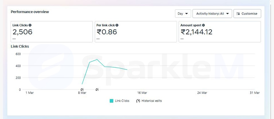 This Meta ad campaign was strategically focused on driving traffic to a website, and it performed exceptionally well in terms of cost efficiency and engagement. The campaign generated a total of 2,506 link clicks, with a minimal cost per click of just ₹0.86, resulting in a total ad spend of ₹2,144.12. The click volume spiked sharply around the second week of March, indicating that the ad creative and targeting were highly effective during that phase. The steady performance that followed shows sustained interest and audience relevance. Overall, this campaign proved to be a highly cost-effective method for boosting website visits, making it a strong example of well-optimized traffic generation through Meta Ads.